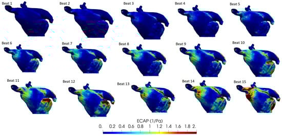 Endothelial cell activation potential (ECAP) maps for 15 simulated cardiac cycles/beats. Higher values (red colour) indicate a higher risk of thrombosis.