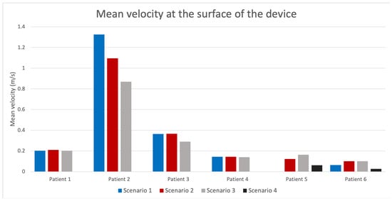 Average blood flow velocities near the device surface for the different simulated scenarios in all analysed patients. Pat 1–3 and Pat 4–6 were without and with device-related thrombus, respectively. Missing bars in some patients indicate simulation divergence.