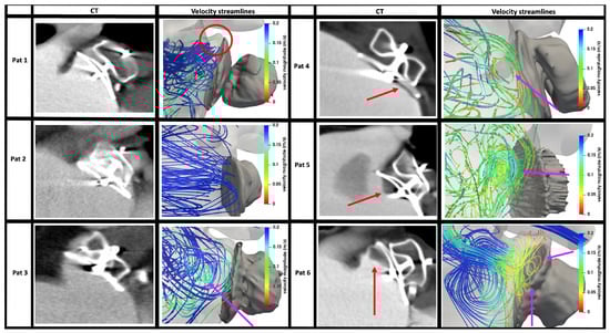 Computed tomography (CT) scans after left atrial appendage implantation for cases with (Pat 4–6) and without (Pat 1–3) device-related thrombus together with streamline-based visualisation of the simulated blood flow patterns, coloured by velocity magnitude (blue and red corresponding to high and low values, respectively). Red arrows in CT scans indicate where the thrombus was found. Pink arrows in the velocity streamline plots indicate flow recirculations or flow stagnation patterns (independently of velocity magnitude); the red circle indicates the pulmonary ridge (PR). Although Pat 1 had an uncovered PR, the velocities in the area were relatively high, reducing the risk of thrombus formation.