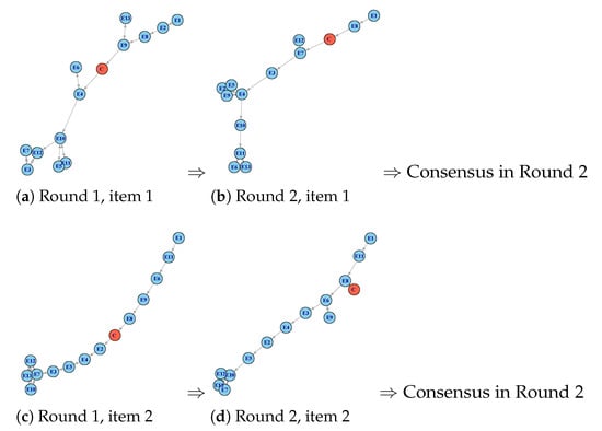 Taking into account the experts’ suggestions, the moderator modified Item 1 in the questionnaire, and it was submitted to the experts in the second round. The experts had access to other experts’ opinions, and they expressed their opinions about the new version of Item 1. In the second round, as we can see in Figure 6b, 11 opinions were greater than by the fuzzy binary relation ≼, and only 2 of them were lower than . As a result, the percentage of agreement for Item 1 in the second round was 11/13 = 84.6%, which was greater than 80%. As there was no comments, we considered that the consensus was reached for Item 1. Accordingly, Item 1 was not included in the third round of the questionnaire. The corresponding information can also be found in the third line of Table 1 in the columns that are dedicated to the second round.