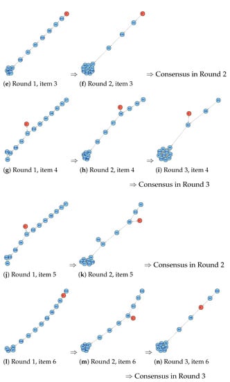 This process was implemented for each one of the 11 items considered in the questionnaire. In order not to be repetitive, we summarize the results obtained for each item as follows. Figure 7a–p represent the fuzzy data corresponding to the 13 expert’s opinions (in blue color), ranked for each round and each item. In this ranking, the comparison FN was plotted in red.