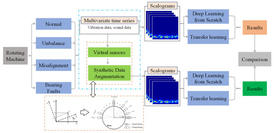 In this process, several defects are simulated using Spectra-Quest’s Machinery Fault Simulator (SpectraQuest Inc., Richmond, VA, USA), and vibration data is obtained for each defect. The time-domain vibration responses are obtained through several sensors, and are transformed into scalograms in the original form, as well as after augmentation through virtual sensors. The details of synthetic data augmentation are discussed in Section 2.2. The vibration scalograms of the original and augmented data are processed in two ways: to train a customized deep learning model from scratch, and to employ transfer learning using existing pretrained deep learning models. Finally, the results of the original and augmented datasets are compared in terms of the training, validation, and testing accuracies of the deep learning models. The following sections provide details of each stage of the proposed methodology.