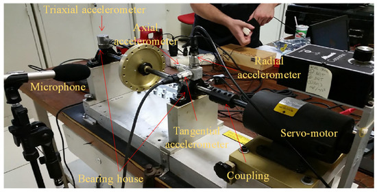 To evaluate the contributions of the current work and validate the proposed methodology, a comprehensive dataset, named as machinery fault data base (MaFaulDa) [45], is selected. The chosen dataset is extensive enough and includes multiple faults in the rotor system and in the supporting bearings, with each fault at different severity levels and different speeds of operation. The SpectraQuest’s machinery fault simulator (MFS) alignment–balance–vibration trainer (ABVT) [46] was used to obtain the MaFaulDa in the form of a multivariate time series. Figure 2 shows the experimental setup to emulate the dynamics of mass unbalance, horizontal misalignment, vertical misalignment, and bearing faults.
