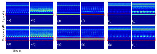 Scalograms of different healthy states for the original and augmented data: (a) normal original x; (b) normal original y; (c) normal virtual xv at π/8; (d) normal virtual xv at π/4; (e) unbalance original x; (f) unbalance original y; (g) unbalance virtual xv at π/8; (h) unbalance virtual xv at π/4; (i) vertical misalignment original x; (j) vertical misalignment original y; (k) vertical misalignment virtual xv at π/8; (l) vertical misalignment virtual xv at π/4. (The horizontal line in the red rectangle shows the speed of rotation at steady state).