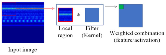 Herein, it is observed that each filter is realizing different features of the input image, which are supplied to the next layers for further processing. The convolution process is mathematically described by Equation (8).