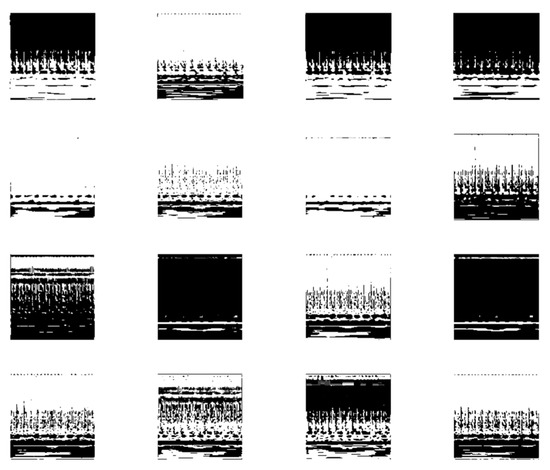 The filter is an array of weight and biases which is multiplied with a patch of the image to obtain a weighted combination (scalar value) of that region of the input. The filter is applied multiple times to the input image and this results in a filtered image at the output, often referred to as the activations, or feature map, of that filter. There are as many filtered images at the output of a convolutional layer as the number of filters in that layer, and the filtered images are arranged in the form of three-dimensional array. The third dimension of the convolutional output is known as the number of channels. A typical example of output from the first convolutional layer of the deep learning model of Table 3 is shown in Figure 7.