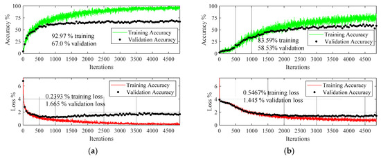 The dataset of Table 1 is comprised of 1951 scenarios of 42 different classes, and each class is described in terms of eight signals obtained through the sensors. For the original dataset, without augmentation, all of the 15,608 (1951 × 8) time series were transformed directly into scalograms, without any preprocessing. The reason for considering the signals from all the sensors is to provide the deep learning model with sufficient data. The 15,608 scalograms of the original data were split into 80% training data, 10% validation data, and 10% test data. To leverage the knowledge of the pretrained networks and get a baseline accuracy on the original data, the deep learning models of ResNet18 and SqueezeNet were employed in a transfer learning framework. The reason for choosing two different pretrained models for transfer learning was to show the effect of the type of pretrained model. Figure 9 shows that the training and validation processes of the two models were interpreted in terms of accuracies and losses.