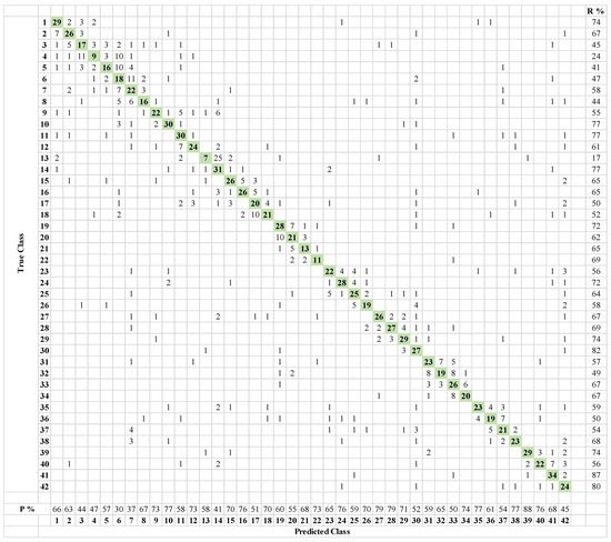 Test confusion matrix of ResNet18 on 10% of original dataset, 69.49% test classification accuracy. (1: normal; 2–8: unbalance with (6, 10, 15, 20, 25, 30, 35) g mass; 9–12: horizontal misalignment of (0.5, 1, 1.5, 2) mm; 13–18: vertical misalignment of (0.51, 0.63, 1.27, 1.4, 1.78, 1.9) mm; 19–22: overhung position ball fault with (0, 6, 20, 35) g unbalance; 23–26: overhung position cage fault with (0, 6, 20, 35) g unbalance; 27–30: overhung position outer race fault with (0, 6, 20, 35) g unbalance; 31–34: underhung position ball fault with (0, 6, 20, 35) g unbalance; 35–38: underhung position cage fault with (0, 6, 20, 35) g unbalance; 39–42: underhung position outer race fault with (0, 6, 20, 35) g unbalance) (R: Recall, P: Precision).