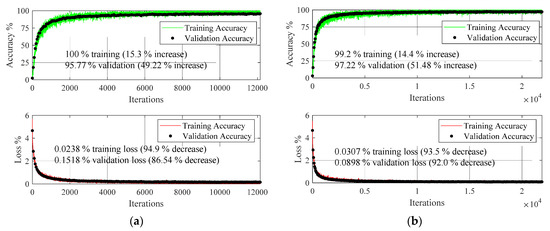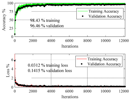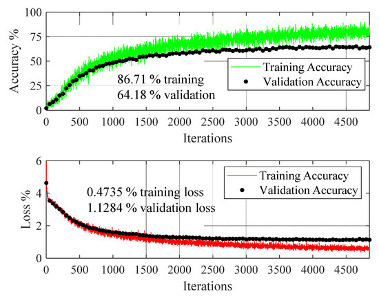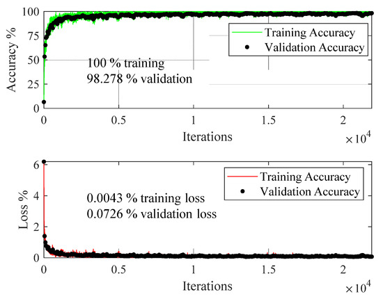 The dataset used in the transfer learning framework was also processed through the customized deep learning model of Table 3, and Figure 13 shows the training and validation process of the network.