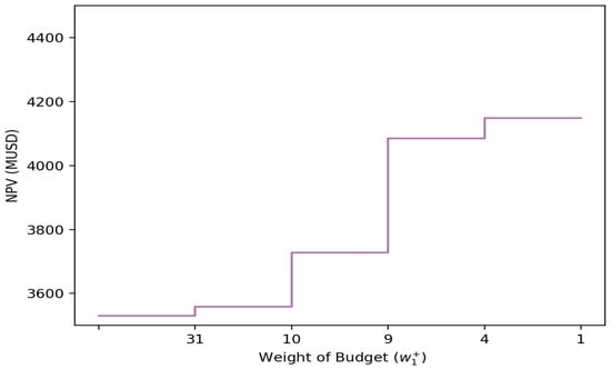 Since the solution to the optimization problem is a discrete selection of projects, it stands to reason that not every change in inputs results in a change in output. To illustrate this, we change the weight of the budget in the object function in (