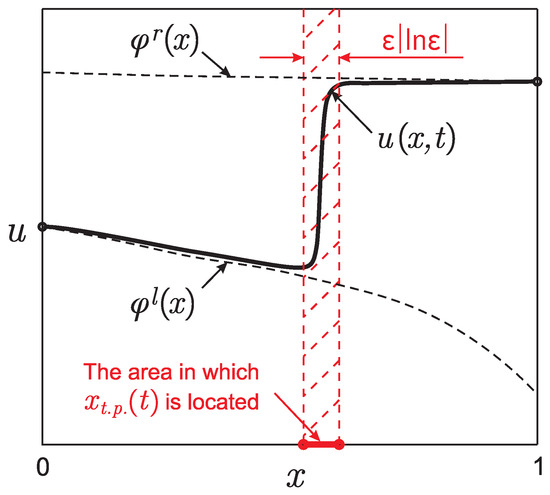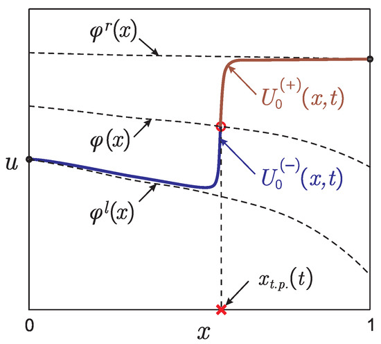 Under certain conditions, the problem (1) can have a solution of the moving front type. A solution of this type is a function that has a narrow interior layer in a small (of the order of ) neighborhood of some point, that moving according to the law . We call the point as “transition poin” (“t.p.”). Outside this neighborhood, the solution is close to one of two functions, or , each of which is independent of time (see Figure 1).