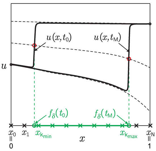 - It is assumed that a uniform grid is introduced with respect to the spatial variable . Let us determine the values of , , by interpolating the function of one variable , given by its grid values , , on a grid with nodes , . Here , . (see Figure 3).