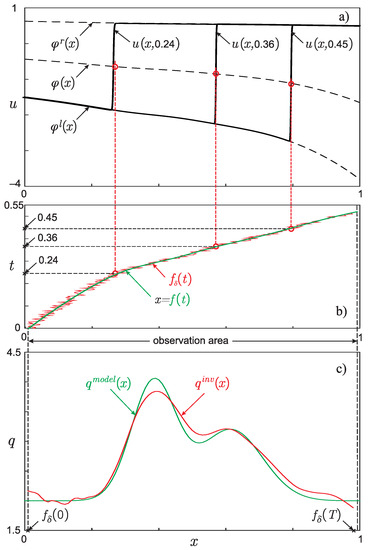 Thus, we have obtained a reduced statement (13) of the original inverse problem (1)–(2). This statement relates the function , which must be recovered when solving the inverse problem, with the data of the inverse problem (function , which determines the position of the moving reaction front , measured experimentally).
