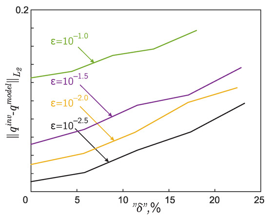 Figure 5 shows the dependence on the error level of the input data “” in percents, where means averaging over the performed set of experiments (10 experiments) for the same . Thus, we have numerically shown that (1) small values of the parameter correspond to a more accurate reconstruction of the unknown function , (2) the inverse problem solution is stable with respect to the input data error level .