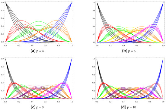 In addition, function can be defined for integers and . Figure 1 depicts some plots of GHT-Bernstein basis functions with different shape control parameters.