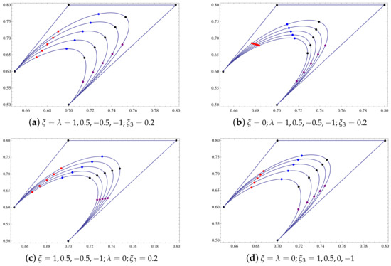 In Figure 2, when the shape parameters varies simultaneously while is fixed then curves inside the control polygon expand and the influence of these curves is at the center of the control polygon. These curves have the same behavior when the and varies. When and fixed and varies, then the influence of curves is on the right-hand side, while when and fixed and varies, then influence of curves is on the left-hand side.