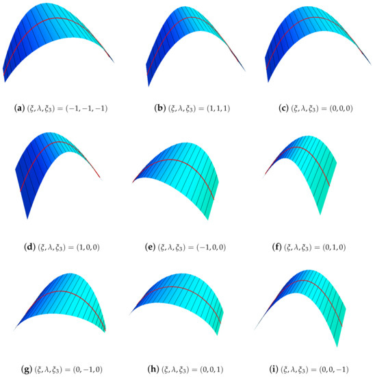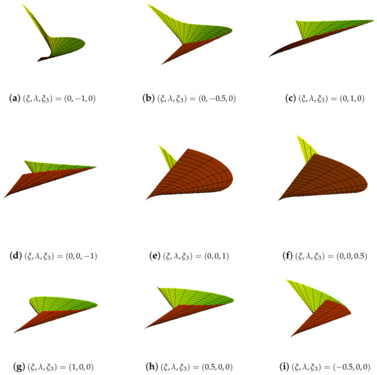 - When we fix two shape parameters and vary the remaining shape parameters one by one, then the behavior of developable surfaces also varies and is obvious in Figure 7d–i. The values of shape parameters are mentioned under each figure.