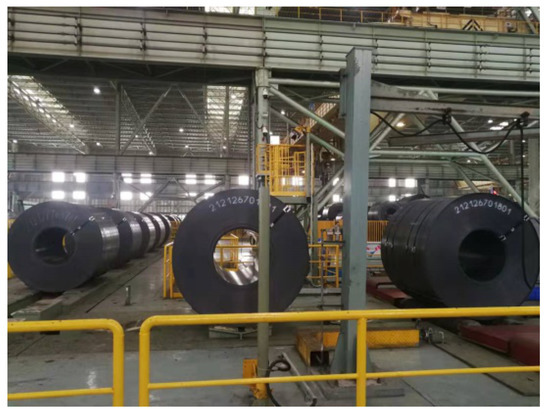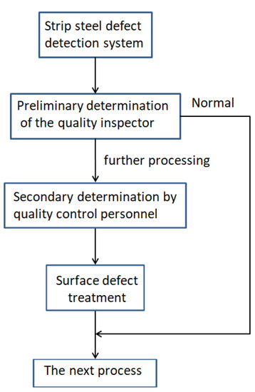 Hot-rolled strip steel is produced by rolling the billet at a temperature higher than the recrystallization temperature and then going through a series of processes such as phosphorus removal, finishing, polishing, edge cutting and straightening. Hot-rolled strip steel has good processing performance and strong coverage ability, which is widely used in automobile manufacturing, home appliance manufacturing, shipbuilding and chemical industry, etc. In the manufacturing process of strip steel, for various reasons [1,2,3], surface defects will inevitably arise, and these defects cannot be completely overcome by improving the process. Therefore, the detection of surface defects in hot rolled strip is an important part of hot rolled strip production and is closely related to the surface quality of the strip. Figure 1 shows the quality inspection process of surface defects in the actual production of a steel mill.