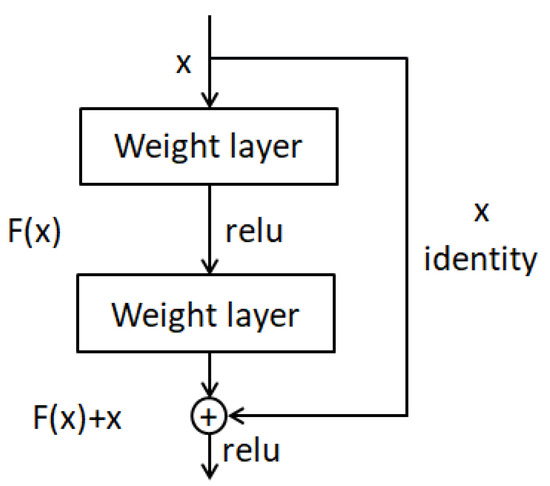 As the deep learning-based network evolves, its structure is deepening; while this helps the network to perform more complex feature pattern extraction, it may also introduce the problem of gradient disappearance or gradient explosion. “Gradient disappearance” and “gradient explosion” can lead to the following shortcomings: (1) Long training time but network convergence becomes very difficult or even non-convergent. (2) The network performance will gradually saturate and even begin to degrade, known as the degradation problem of deep networks. To solve such problems, He et al. [23] proposed the ResNet network, which makes it possible to obtain a good performance and efficiency of the network even when the number of network layers is very deep (even over 1000 layers). The deep residual learning framework of ResNet is shown in Figure 4.