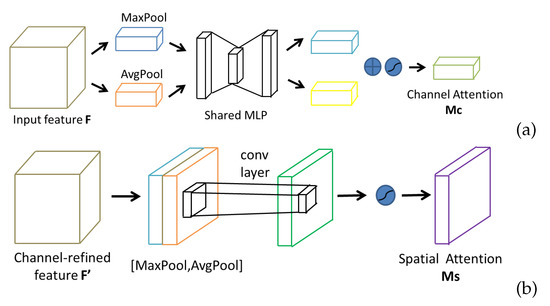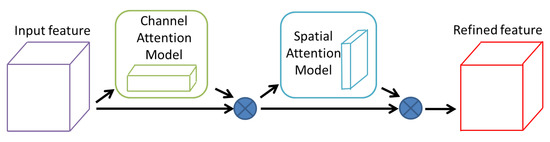 Woo et al. [24] proposed the convolutional block attention module (CBAM) in 2018, a simple and effective attention module for feed-forward convolutional neural networks. The significance of attention has been extensively studied in the previous literature [25,26,27,28]. Attention not only tells people where to focus their attention, it also improves representation of interest. Representation can be improved by using attentional mechanisms: focusing on important features and suppressing unnecessary ones. The structure of CBAM is shown in Figure 5. The CBAM module has two sequential sub-modules: channel attention model and spatial attention model.