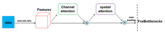 We adopt the FcaBottleneck instead of the Bottleneck structure in the original ResNet50 and place the spatial attention mechanism and the channel attention mechanism before the FcaBottleneck. In other words, we adopt CBAM outside the Bottleneck of ResNet for improvement and FcaNet inside the Bottleneck for improvement, so that the original Bottleneck, is converted to FcaBottleneck. The difference between the original Bottleneck in ResNet50 and the FcaBottleneck after the addition of FcaNet is shown in Figure 8.
