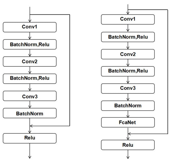 As shown in Figure 8, The flow chart on the left is Bottleneck and the flow chart on the right is FcaBottleneck. We can see the main difference between Bottleneck and FcaBottleneck: FcaBottleneck has an additional layer of FcaNet than Bottleneck. The code details can be found at: https://github.com/Fighter20092392/ResNet50-CBAM-FcaNet (accessed on 5 July 2021).