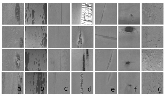 Samples of seven kinds of typical surface on X-SDD. (a) oxide scale of plate system. (b) red iron sheet. (c) surface scratches. (d) slag inclusions. (e) finishing roll printing. (f) iron sheet ash. (g) oxide scale of temperature system.