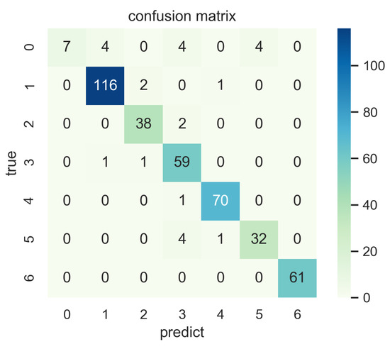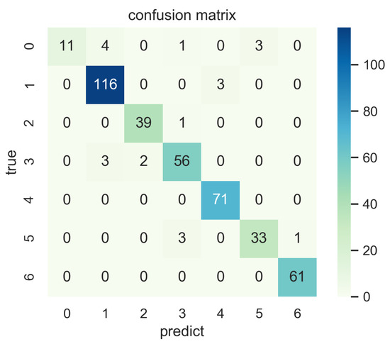 The confusion matrix of our proposed method is shown in Figure 10. The horizontal and vertical coordinates of 0–6 in the figure represent the oxide scale of plate system, red iron sheet, surface scratches, slag inclusions, finishing roll printing, iron sheet ash and oxide scale of temperature system, respectively. As can be seen from the confusion matrix, our method can classify most defect categories very accurately, with less accuracy only in the case of oxide scale of temperature system. Our model has 7 correct classifications and 12 incorrect classifications for oxide scale of plate system, with a correct classification rate of only 36.84% for this type of defect. The reason for this result may be that the amount of data on oxide scale of temperature system is small and the algorithm fails to learn effectively for this type of defect. A possible solution to this problem is to perform more data augmentation for this class of defects, using multiple models for cascading or ensemble learning. In the next part of this paper, we will try to solve the problem by using an ensemble learning approach.