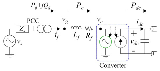 The conventional VSC is also referred to as an average model, which is represented in Figure 2. This model consists of one controlled voltage source on the AC side, and another controlled current source on the direct current (DC) side. The state space model of the conventional VSC converter is derived by the connection to the grid through a power transformer; therefore, its control can be performed by the impedance among two buses and , defined by and . The equivalent circuit of the grid is represented by a grid impedance and a voltage source .