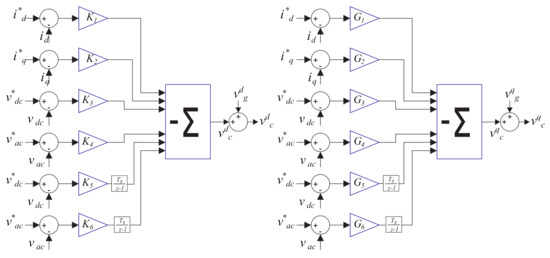 In this case, we selected , , , , and , as the external variable, since they are typically the available measurements in practice. Moreover, the variables , will permit implementation of the controller, as they provide the voltage reference for the VSC in terms of -components.