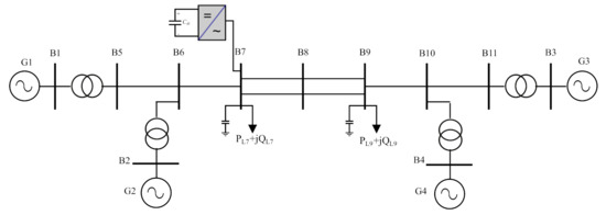 In order to validate the data-driven controller of a VSC-based STATCOM model, a two areas power system is employed. The test system is simulated in Matlab/Simulink software; it is comprised of a 2-area power system connected by two AC transmission lines and two machines in each area; these test systems are well-known, such as the Kundurs 2-area 4-machine power system. The complete details of the electrical grid can be found in [33]. The single-line diagram can be seen in Figure 4. The active power exchange between two areas is around 400 MW, going from area 1 to area 2, and the swing generator corresponds to machine 2, labeled as G2. The STATCOM model is connected to Bus 7 (B7) for controlling the AC bus voltage and the power ratings of the STATCOM can be seen in Appendix A, particularly in Table A1, where a step-up transformer 195 kV/230 kV is employed to connect it to the grid.
