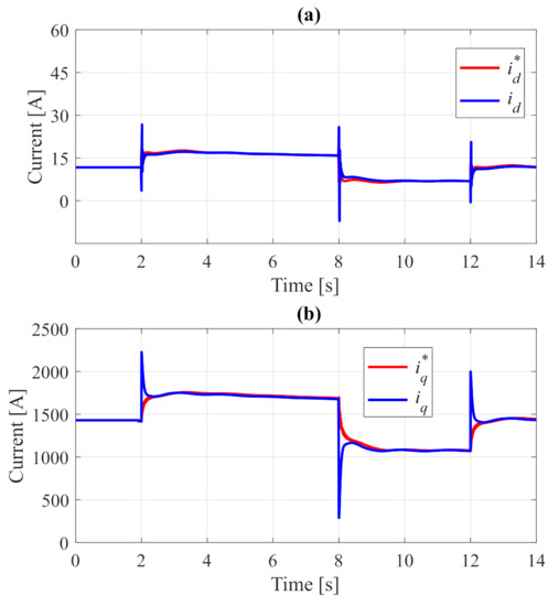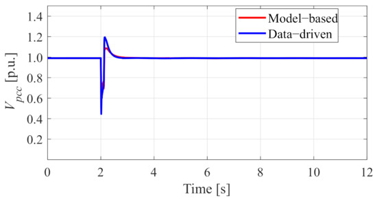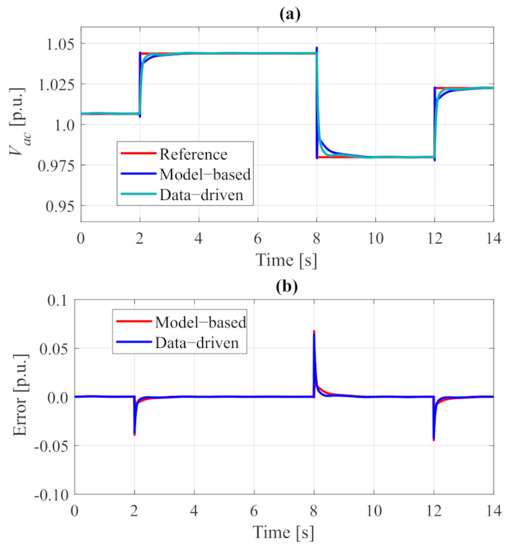 To demonstrate the performance of the proposed method, we first use a test for comparing both model-based and data-driven control, which consists of changing the AC voltage reference . For this scenario, remains unchanged given that it should be constant according to [34]; this means that and should be effectively compensated for by the controller in order to keep and close to their references.