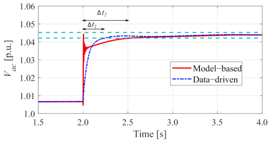 Figure 5a shows the results for different set points of AC voltages. First, the is stepped up from 1.006 to 1.044 p.u. at s; then, it is also stepped down from 1.044 to 0.98 p.u. at s; finally, at s the reference changes from 0.97 to 1.022 p.u. Notice that both controls present similar behavior during the changes of voltage; this can be confirmed with the error of differences shown in Figure 5b. Faster response time represents a faster time to reach a new steady-state defined by a particular variable due to reference changes, which can be measured with . Figure 6 shows a fair comparison of the model-based controller and the proposed method during the first voltage step shown in Figure 5. Notice that corresponds to the time in which the data-driven controller reaches the new steady-state, while is the elapsed time by the conventional model-based control. In conclusion, corresponds to the settling time which is around 0.242 s, whilst is close to 0.426. Based on the results, the VSC-based STATCOM model with a conventional controller takes more time to reach the new steady-state compared to the data-driven controller. Other time steps are also used to analyze the dynamic response of the controller, and these are summarized in Table 1.