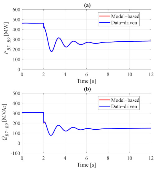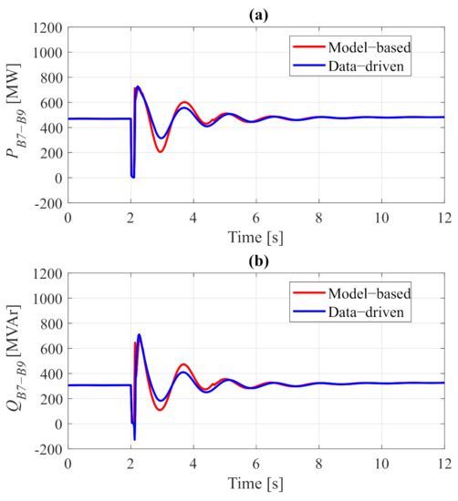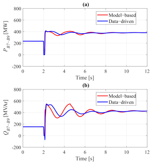 To assess the performance of the STATCOM after a load shedding, a 200 MW load is disconnected from Bus 9. The load shedding decreases the power flow between the two areas bringing a new condition to the generation (rotor angles). Figure 15 and Figure 16 show the comparison between the transient response of the model-based and data-driven controllers. Regarding the real and reactive power flows shown in Figure 15, both controllers present quite a similar performance. The transient response of the AC voltage shown in Figure 16 reaches a peak voltage of 1.03 p.u. when the data-driven controller is employed. That voltage is a bit higher than that produced by the model-based controller but both controllers match very well due to both producing the same magnitude on the first oscillation and almost the same settling time. The reactive power injected by the STATCOM can be shown in Figure 16, where both controllers present a similar behavior. Notice that the load shedding will demand less reactive power as expected.