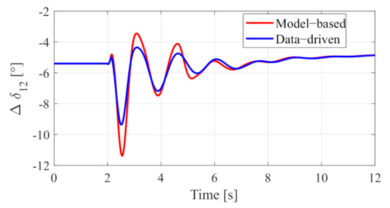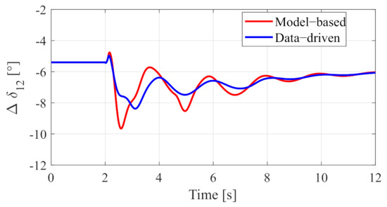 In this case, a transient fault is analyzed, which is cleaned up by opening the circuit-breakers of the faulted transmission line. The dynamic response corresponding to voltage at the PCC is depicted in Figure 12, where significant differences occur between the proposed control scheme and the model-based control. In addition, Figure 13 shows the power flow changes after the fault clearing time. The power flow measurements are taken from the non-faulted transmission line. The power transmission losses are increased due to the presence of only one transmission line. The damping capability is highly noticeable in Figure 14, which shows the rotor angle difference after the clearing time and due to the change of topology caused by the opening of one transmission line. Figure 11 and Figure 14 help to confirm the dynamic performance of the data-driven controller in comparison with the conventional model-based controller. Notice that a better performance is exhibited when the STATCOM is controlled by the data-driven approach. Finally, the described results help to confirm the dynamic performance of the data-driven controller in comparison with the model-based controller, where significant differences appear during the transient period. Table 2 summarizes the controller performance during transient faults after evaluating different time steps; voltage recovery after the fault clearing time. Finally, considering all analyzed variables, the results showed that the data-driven controller offers better performance during transient events because the resulting power oscillations are smaller in magnitude for all analyzed scenarios.