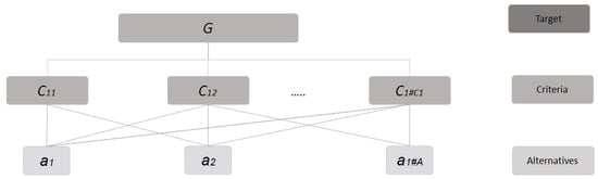 The main characteristic of the AHP is that the decision problem is modelled by means of a hierarchy in whose upper vertex is the main objective of the problem, the goal to be achieved, and at the base are the possible alternatives to be evaluated. The intermediate levels represent the criteria (which in turn can also be structured in hierarchies) since which the decision is made. The second feature of the method is that, at each level of the hierarchy, comparisons are made between pairs of elements at that level, based on the importance or contribution of each to the higher-level element to which they are linked. Finally, once the contribution of each element to the elements at the next higher level of the hierarchy has been assessed, the overall contribution of each alternative to the main objective or goal is calculated by means of an additive aggregation [,].