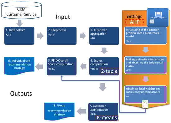 Given the limitations of RFM models, some authors have considered including extensions to the model using the fuzzy two-tuple linguistic model to solve the aforementioned lack of precision []. A frequent problem in the application of the model is to determine the weight of each of the variables, which obviously depends on business criteria. Some authors solve this problem by using AHP [] which allows this type of decision to be made easily by means of pairwise comparisons and consistency checks. Frequently, authors propose the use of clustering algorithms such as k-means after the application of the RFM model [], k-means is one of the most widely used algorithms in clustering processes [] providing in our model a segmentation and classification of customers so that a strategy can be defined for each grouping. In the model proposed in this article, these improvements to the original model will be used.