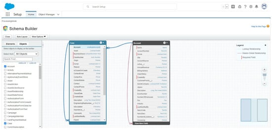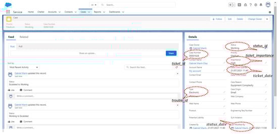 The proposed model is based on four parameters that have a direct impact on quality of service [,] and are present in the data model of any CRM, see Figures 4 and 6, which are crucial in case management during customer support processes: , when the client last opened a case; , how often the customer interacts with the contact centre; , what is the importance of customer interactions; and , how long it has taken to resolve issues. A crucial aspect such as establishing the importance of each of the variables in the model will be solved by using the analytical hierarchy process (AHP).
