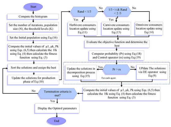 Generally, the proposed AEODE method works on calculating the histogram of the provided image. Then, it creates random candidate solutions subject to the minimum and maximum histogram values. Each candidate solution includes a collection of position values that design the threshold values. The fuzzy entropy is employed as a fitness function to assess the quality of the candidate solutions, and the best-obtained solution has the most significant fitness value. After that, the current candidate solutions are updated according to a condition with a random value to operate the AEO or DE. After completing the updating procedure for the given solutions, the terminal criteria are checked to verify whether they are satisfied or not, so the preceding steps are executed again. We implement extensive experiments, using benchmark images to evaluate the AEODE method; then, we compare it to many existing optimization methods.