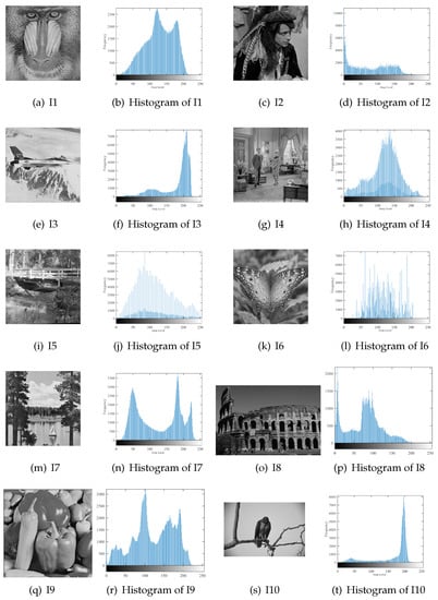 We compare the proposed AEODE method with relevant approaches to segment 10 standard test images, as shown in Figure 2. In addition, the histogram of each image is given in Figure 2 which indicates the characteristic of each image. Swarm parameters are adjusted to their original implementations [28]. The number of population is set to 20, while the dimension equals the threshold level. Moreover, the iteration number is set to 100, and all parameters are selected, depending on the recommendation by the authors of [29].
