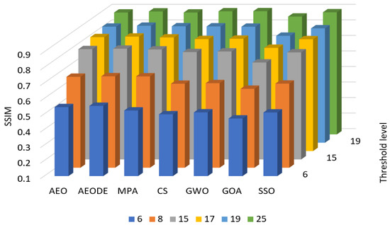 Figure 4 summarizes the average SSIM values with different threshold levels. From Figure 4, we notice that the AEODE outperforms other algorithms, such as AEO, MPA, CS, GWO, GOA, and SSO, by achieving the highest average of SSIM with different threshold levels, with a slight advantage over MPA and SSO.