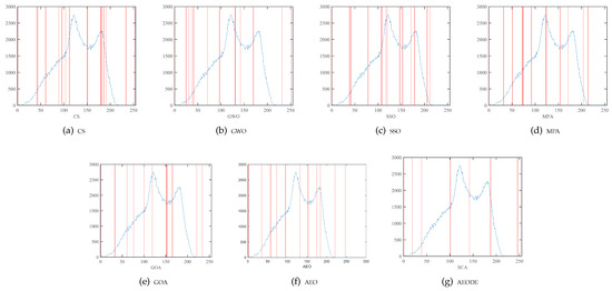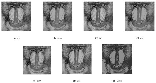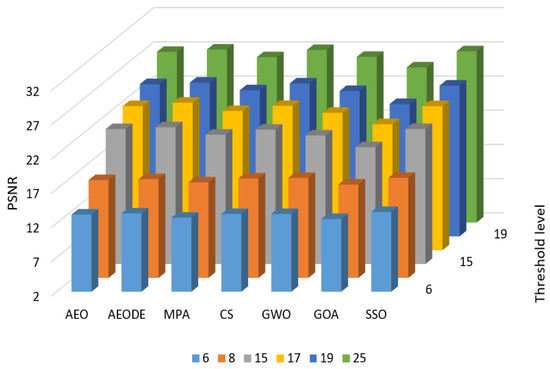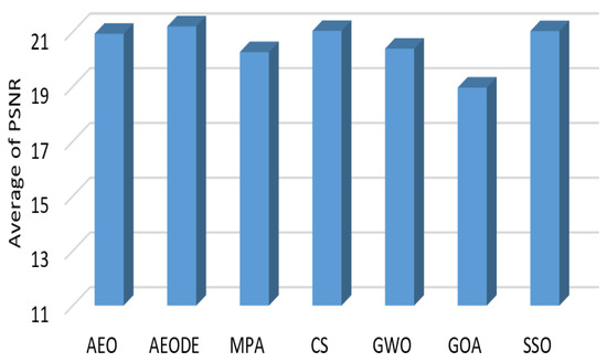 Figure 6 summarizes the average PSNR values with all threshold levels. Figure 6 shows that our proposed method outperforms other optimization algorithms by achieving the highest average of PSNR with different threshold levels for all images. GOA achieves the worst performance, putting it last.