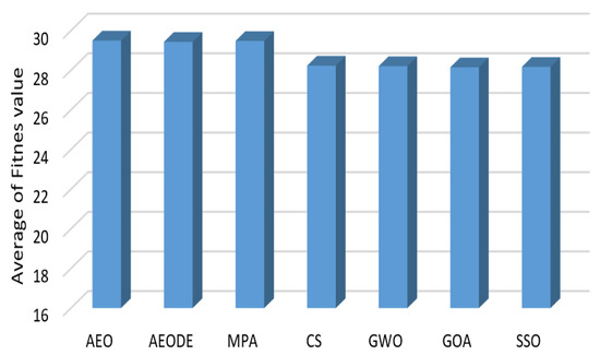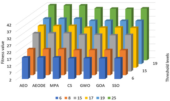 Table 3 shows that all optimization algorithms achieve acceptable fitness values with all threshold levels. There is a slight advantage (in decimal levels) between each one. All optimization algorithms achieve higher fitness values along with higher thresholding levels. The higher the thresholding value, the better the fitness value obtained. Applying the 6, 8, 15, 17, 19, and 25 threshold levels achieves fitness values of 17, 20, 29, 32, 34, and 41, respectively. Figure 8 summarizes the average fitness values with all threshold levels. Based on Figure 8, AEODE, MPA, and AEO came in the first, second, and third ranks, respectively, while GOA is ranked last.