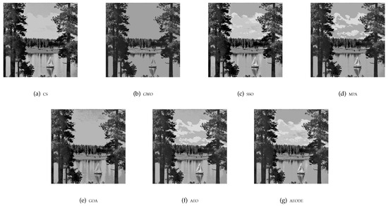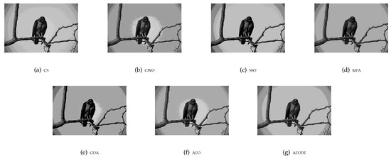 From Table 5, it can be seen that the AEODE achieved the highest mean rank compared to all methods in both SSIM and PSNR measures, followed by AEO, MPA, CS, and GWO, respectively, where the GOA ranked last in the PSNR measure. In the SSIM measure, the AEO, CS, and SSO ranked second, third, and fourth, respectively, followed by MPA and GWO. The GOA also came in last. However, the AEODE obtained the best values in the PSNR and SSIM measure, and it achieved the fourth rank after AEO, MPA, and GOA in the fitness function measure. This can be due to the fact that the fitness function did not measure the quality of the image like the other two measures. Therefore, we can conclude that the AEODE can effectively segment images better than the compared methods.