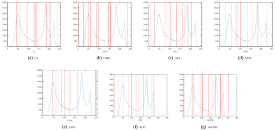 Figure 3 shows that the AEODE performs better in both of the low thresholding levels (i.e., 5 and 6) and also in the higher thresholding levels (i.e., 19 and 25), while GOA shows the lowest performance among other optimization algorithms.