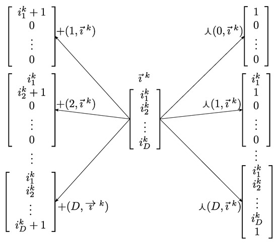 - The system has one or more integer solutions. In this case, for each solution , the new index , which must be sequential to , is calculated. and remain unchanged. Each of these solutions, whose calculation is detailed in Section 3.1, must be explored independently as described in Section 3.3.