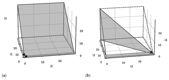 This hyperplane is calculated in a way similar to the single-domain case in Section 3.4. First, the face orthogonal to the canonical axes that contains is built (trivial solution to Equation (9)). Then, if any point in lies beyond this hyperplane (i.e., violates Equation (10)), we iteratively modify it. In the presented example, the first trivial face is generated as: