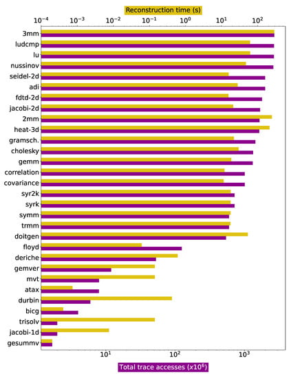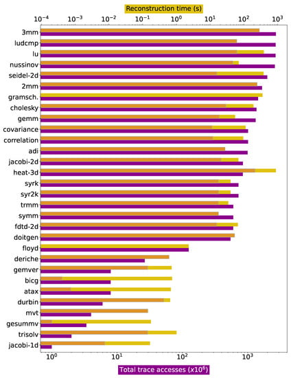 Reconstruction times (upper axis) and trace sizes (lower axis) for the tiled PolyBench/C benchmarks, ordered by trace size. Axes are logarithmic. The left bar in the time axis represents the reconstruction time for the original, untiled code and is included for reference.