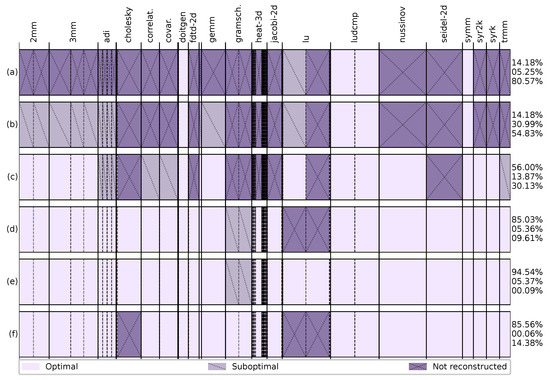 For the input traces where the reconstruction process fails, the main source of stagnation are local maxima in the fitness value. We propose to identify these situations with points in the exploration space that have neither linear solution, nor a solution introducing a new upper bounds hyperplane. At this point, and before checking if any solution with a new lower bounds face is feasible or increasing the polyhedron dimensionality, the engine checks whether the current recognition stint has produced enough progress. In this context, we define a recognition stint as a set of consecutive iteration points that can be added to the polyhedron without the need to add any new bounds or dimensions to the polyhedron. If the length of the stint is above average, exploration proceeds normally. Otherwise, the exploration of this branch is deferred and the most promising one according to its fitness value is processed next. As shown in Figure 7e, 99.91% trace coverage is achieved using this method. The 0.09% of uncovered loops is due to exploration heuristic failure, and corresponds to 4 small and similar loops in heat-3d. The optimal solution paths for these loops score consistently low on the employed fitness functions, and therefore they are never explored before memory is exhausted. On the other hand, if we tune the exploration heuristics to reconstruct these traces, then others become intractable. The 5.37% of loops that are suboptimally covered corresponds to several small loops in which the exploration heuristic finds a solution that is a local maximum, but more importantly to the two gramschmidt subtraces mentioned in Section 4.3, which require the use of rational coefficients to be optimally reconstructed. These are covered in Section 4.5. In all cases, the achieved suboptimal solutions are at most one loop level deeper than the optimal ones, while some of them have optimal dimensionality, but introduce more faces than necessary.