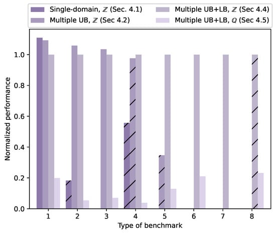 Reconstruction performance grouping benchmarks by type as shown in Table 2. Results are normalized to the performance of the approach using multiple upper and lower bounds over presented in Section 4.4. Hatched bars indicate suboptimal reconstruction.